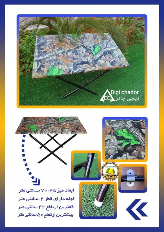 با تولید چادر و صندلی vip از پارچه نانو برزنت طرحدار ،به سفارش مشتریان عزیز میزهای طرحدار به صورت ست vip با طرحهای سرخپوستی، پاییزه و جنگلی به تولید انبوه رسید که با کیفیت A از بهترین متریال موجود بهره گرفته شده و با قابلیت تنظیم ارتفاع در سبد فروش مجموعه دیجی چادر قرار گرفته. این میزهای تاشو را میتوانید در مسافرتها و یا استفاده در تراس و بالکن و باغ و حیاط و حتی داخل منزل به راحتی استفاده کنید و باز و بست راحت آن این امکان را به شما میدهد تا در حالت جمع شده به حالت کتابی و جمع و جور در هر جا به راحتی نگهداری کنید و یا در صندوق خودو قرار دهید و به مسافرت ببرید. این محصول کاربردی را به صورت تک و یا پکیج به همراه صندلی و یا پکیج کامل به همراه چادر مسافرتی میتوانید از وبسایت دیجی چادر تهیه فرمایید.