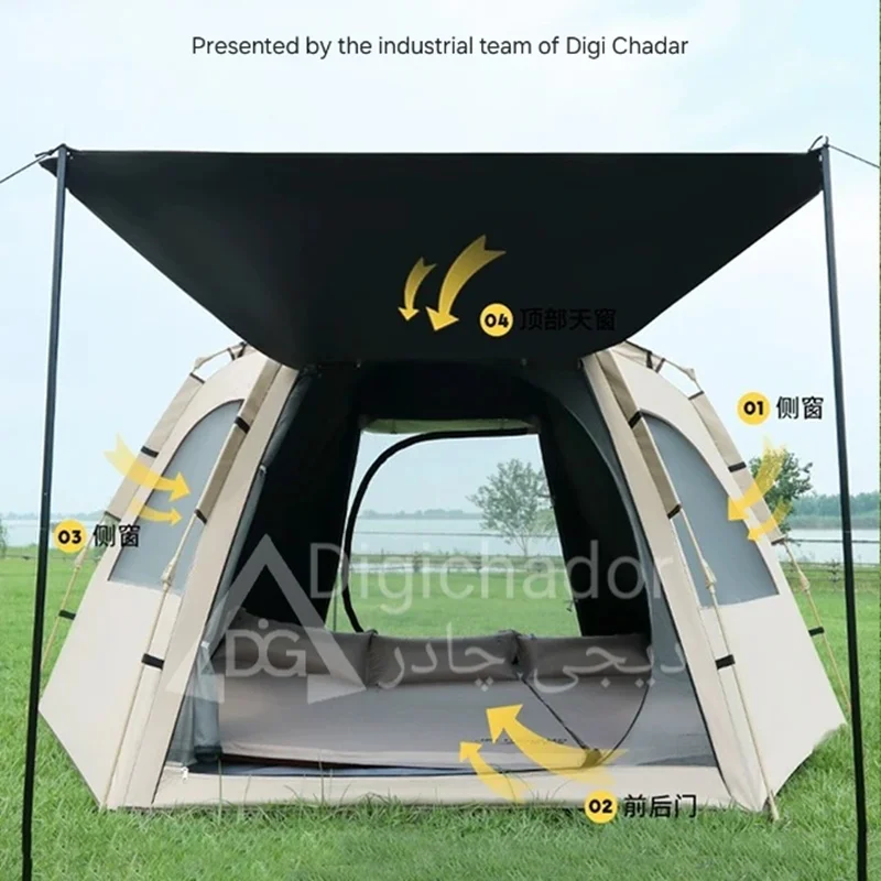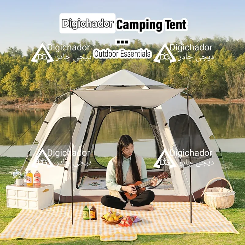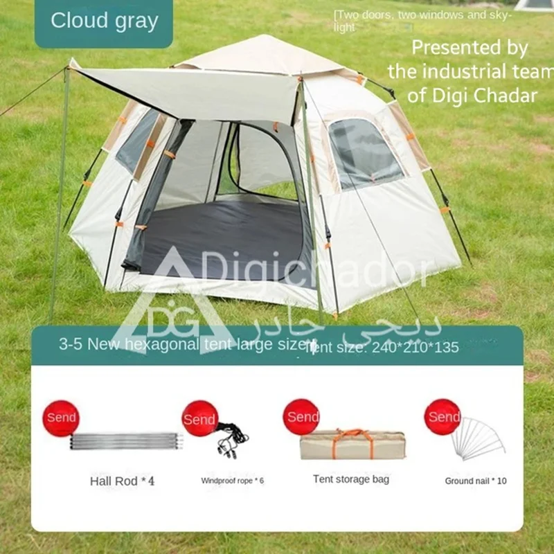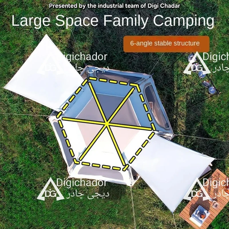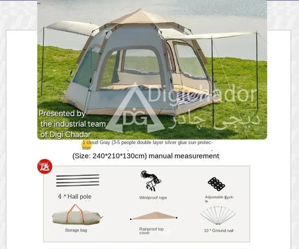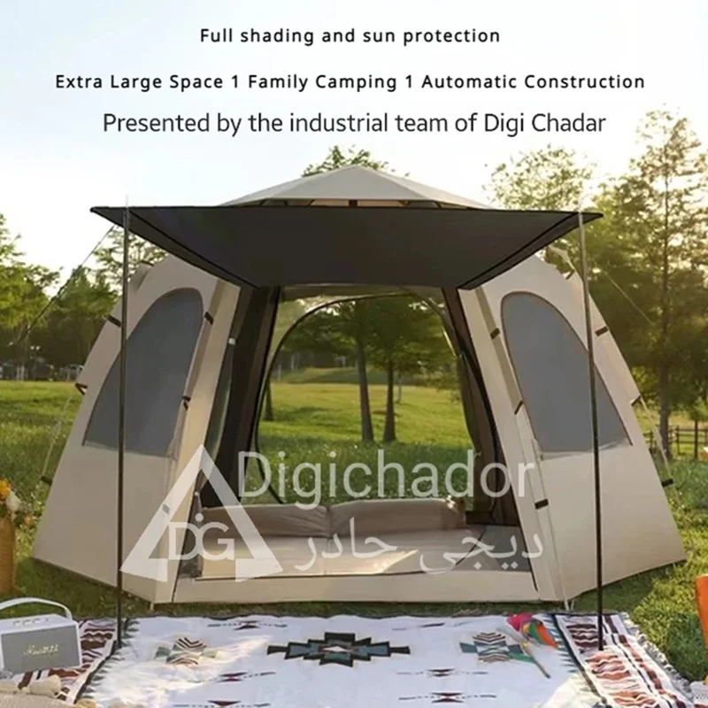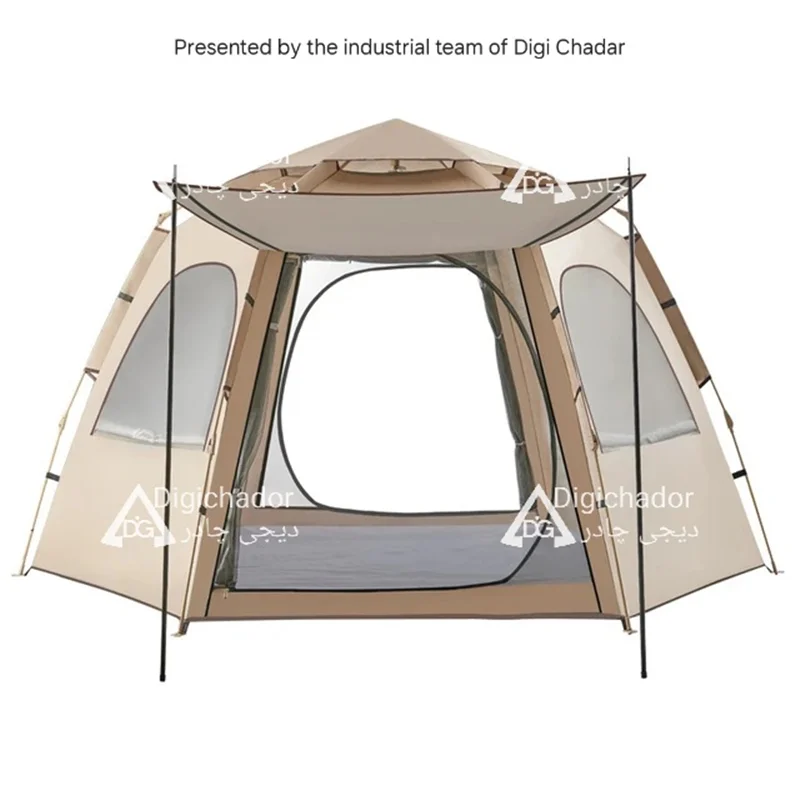 بنا بر درخواستهای مکرر مشتریان سایز بزرگ و جدید چادر شش ضلعی اتومات هم به سبد فروش دیجی چادر اصافه شد .محصولی خاص و منحصر به فرد با کاربرد ۲ منظوره چادر و پشه بند با قابلیت باز شو در 6 طرف و تبدیل به یک پشه بند اتومات حرفه ای . امکان ورود و خروج از دو طرف چادر . امکان باز و بست سریع و بدون نیاز به مهارت خاص. قابل حمل و نقل در پیمایش ها و پیاده روی های طولانی با توجه به وزن و حجم کم چادر .در مدل ۶ ضلعی به دلیل بهره بردن از ۶ ضلع استقرار بهتری در برابر بادهای شدید را دارد و با بستن میخ ها به کف تعادل بهتری را روی زمین به دست میآورد.