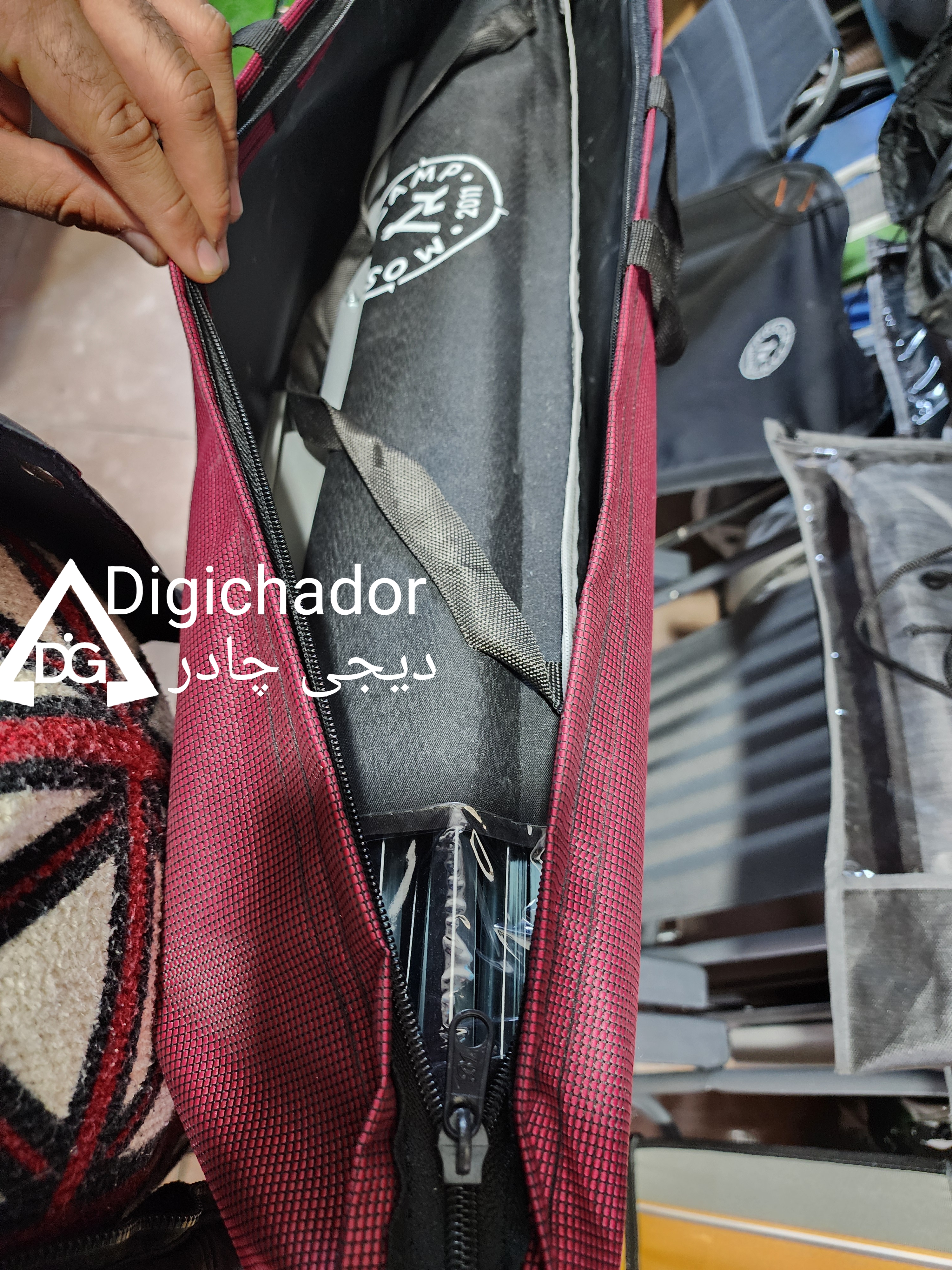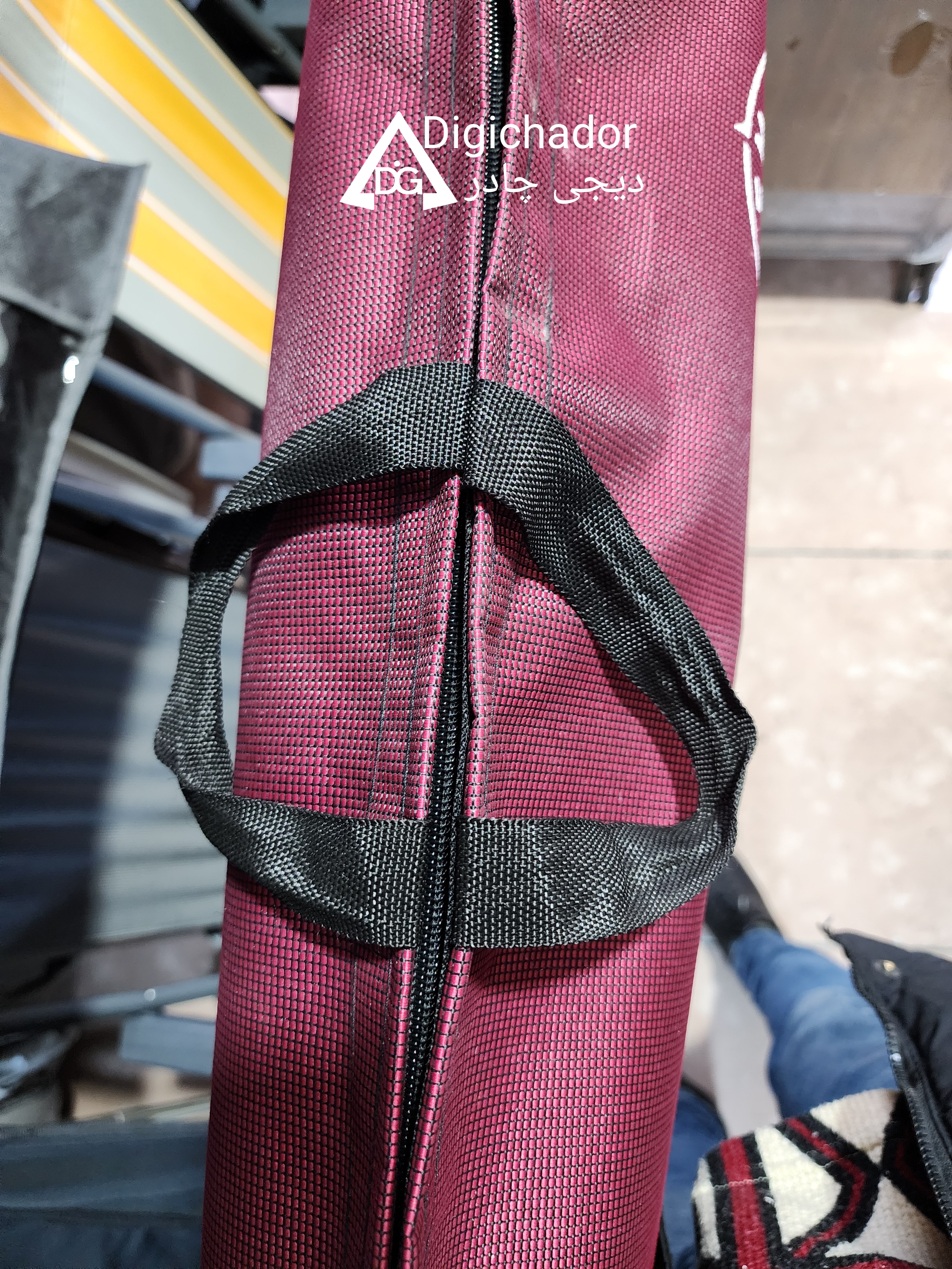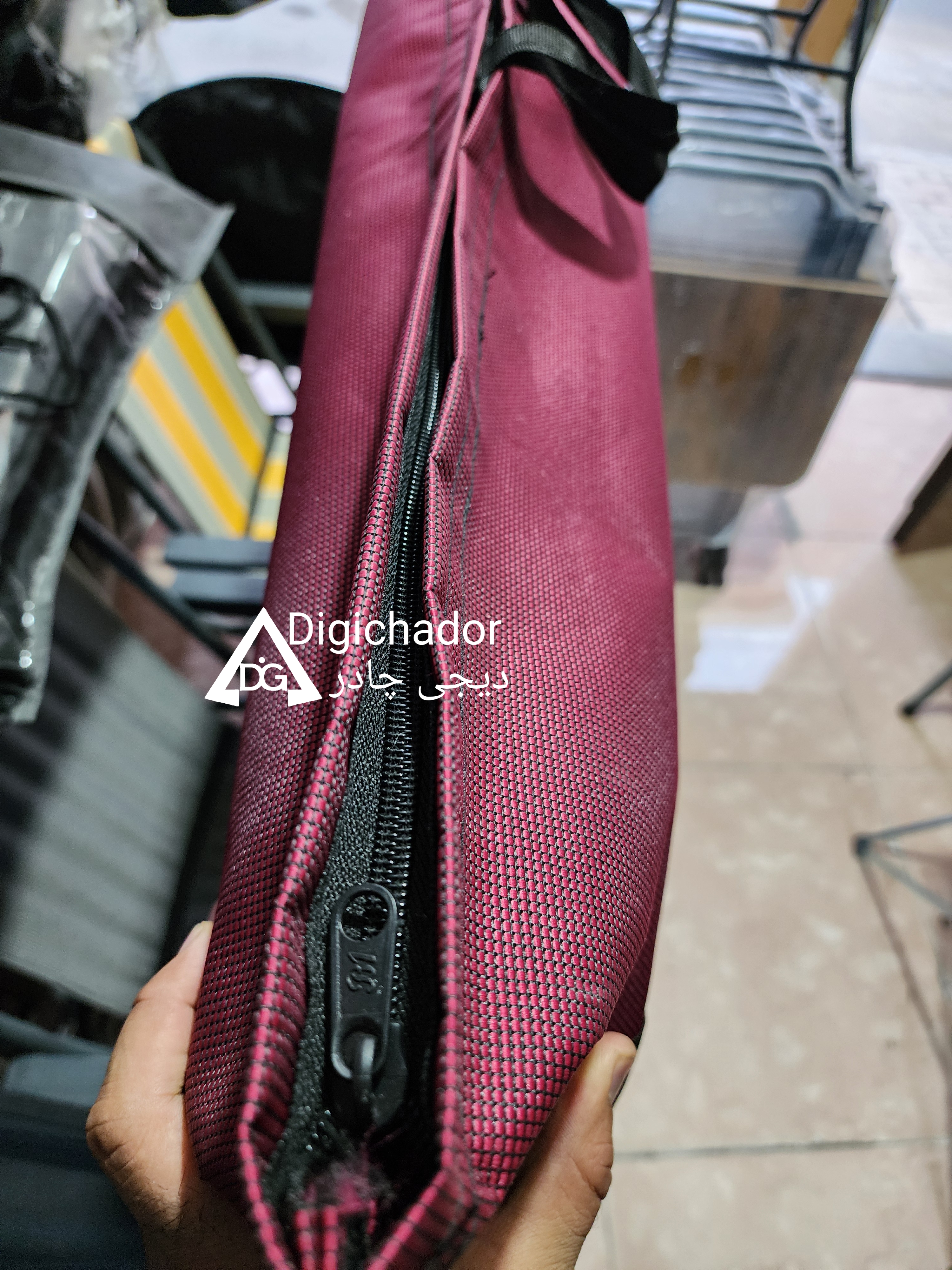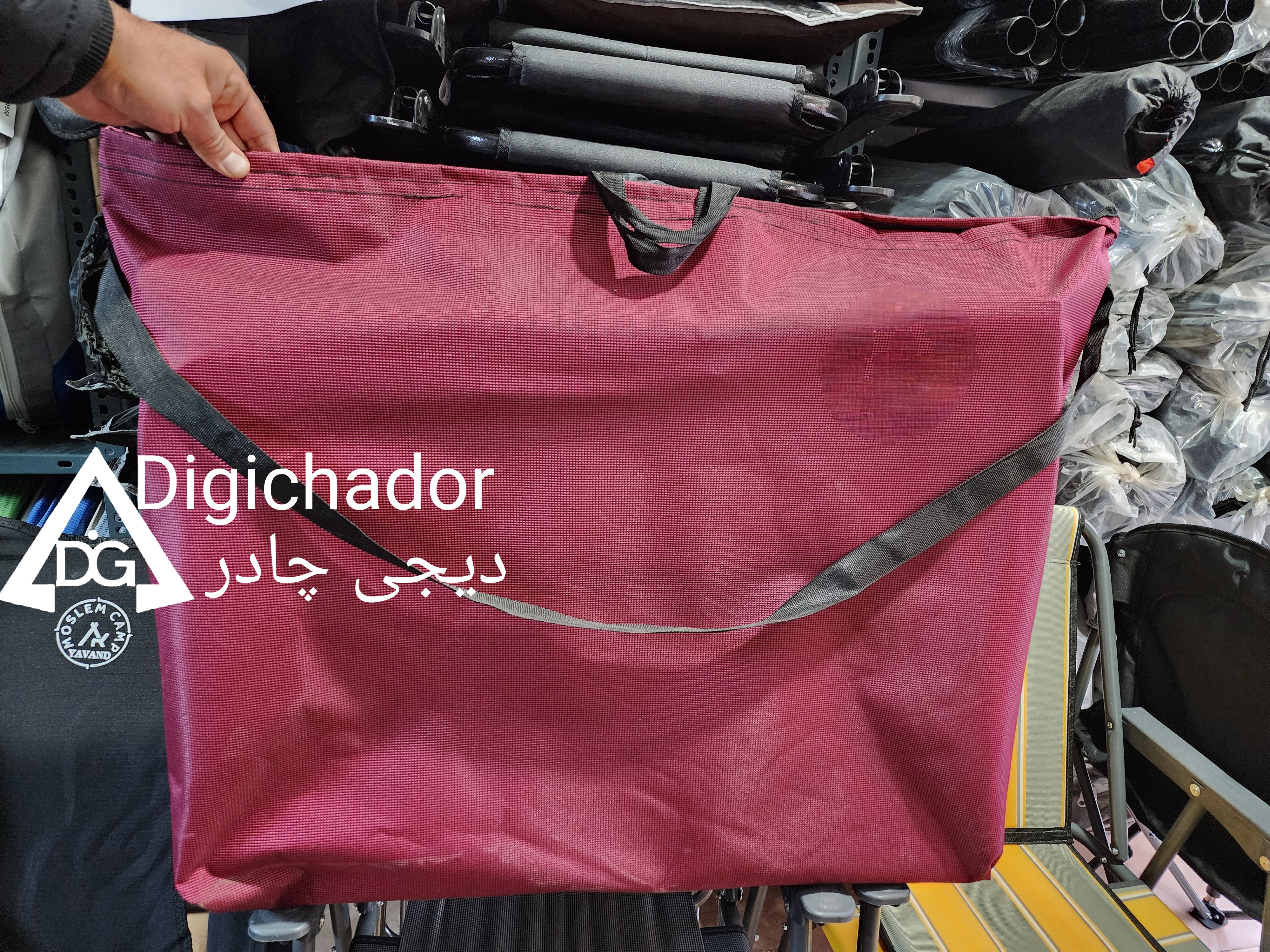 کیف صندلی دیجی چادر محصولی جدید است که به دنبال سفارشات متعدد مشتریان به تولید انبوه رسیده و بسیار کاربردی میباشد. این محصول امکان حمل همزمان دو عدد صندلی تاشو دسته مبلی را دارد و با توجه به پارچه مقاوم سومیت و دوخت صنعتی به کار گرفته شده جهت تولید محصولی بسیار مقاوم و شکیل میباشد که در زمان حمل صندلی علاوه بر راحتی حمل همزمان دو عدد صندلی،به علت پارچه ضخیم و مقاوم همانند یک محافظ از آسیب رسیدن به محصول نیز جلوگیری میکند. این کیف مشابه کیف های پک دو نفره امکان حمل دو عدد صندلی به همراه میز را دارد. این محصول مجهز به دستگیره حمل و بند دوش آویز میباشد که زمان حمل در مسافتهای طولانی راحتتر حمل گردد. پارچه این محصول سومیت پشت برزنت درجه یک میباشد که به مراتب نسبت به جودون مقاومتر و ضخیمتر میباشد و از جنس و طرح صندلی های سوپر پلاس و استرانگ دیجی چادر میباشد .