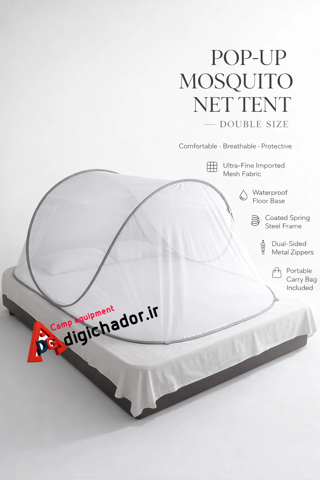 پشه بندهای مدل قایقی (کمپی) دیجی چادر بسیار کاربردی و مناسب برای استفاده یک تا دونفره در دو سایز انفرادی و دو نفره تولید میشود و با تنوع در جنس و طرح و مدل سعی در برآورده کردن نیاز شما عزیزان است تا از خوابی دلنشین و آسوده لذت ببرید. این محصول بسیار سبک ، با باز و بست راحت و سریع بدون نیاز به اتصال و مهار کردن این امکان رو برای شما به ارمغان میآورد تا در هر شرایطی و هر مکانی مانند طبیعت، در منزل و یا روی تخت امکان باز و بست و برپا کردن این محصول را داشته باشید و به راحتی استفاده کنید. متریال مورد استفاده در مدل صادراتی از تمام مدلها قوی تر و تنها مدل استاندارد با کسب مجوزهای اروپایی جهت صادرات است که در ادامه به چند مورد اشاره میکنیم؛ تور این محصول حریر با بافت ریز میباشد که موجب شده از عبور کوچکترین حشرات نیز جلوگیری کند . این محصول از کف تفلون ضد آب درجه یک بهره میبرد که باعث میشود قابل استفاده بر روی زمینهای نمدار و مرطوب مثل محیط های باز و چمن باشد.فنر استفاده شده در این مدل نسبت به باقی مدلها قایقی ضخامت بیشتری دارد و سرزیپ های این محصول نیز دو دسته فلزی میباشد که امکان باز و بست از داخل و بیرون رو فراهم آورد.در اطرف این محصول 8 عدد حلقه D تعبیه شده تا در شرایط زمین شیبدار و یا وزش باد بتوانند با بستن و یا میخ کردن به زمین محصول رو مهار کرد.یک امتیاز دیگر این محصول نسبت به مدلهای دیگر وجود دو درب ورودی است که یکی در ضلع بزرگ و دیگری در ضلع کوچک تعبیه شده و شما میتوانید از جلو یا کنار پشه بند ورود و خروج داشته باشید. پشه بندهای قایقی به سرعت باز و بست میشوند و به صورت دایره ای شکل در کیف حمل مخصوص قرار میگیرد. این محصول زیر نظر تیم کیفیت دیجی چادر با استاندارهای اروپایی تولید شده و محصول پیشنهادی ما به عنوان محصول درجه یک میباشد.