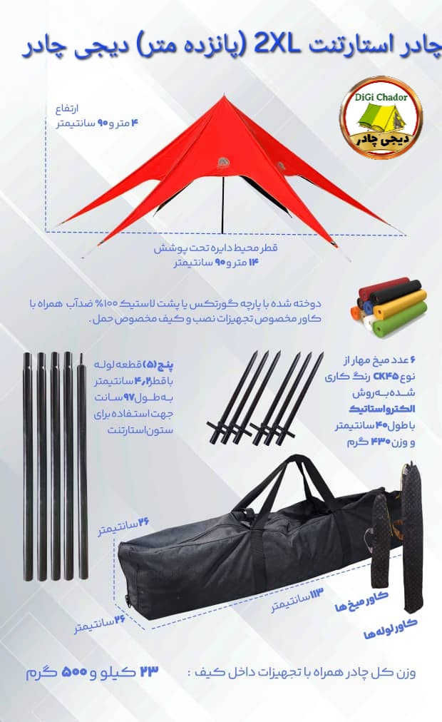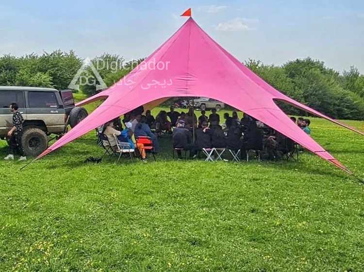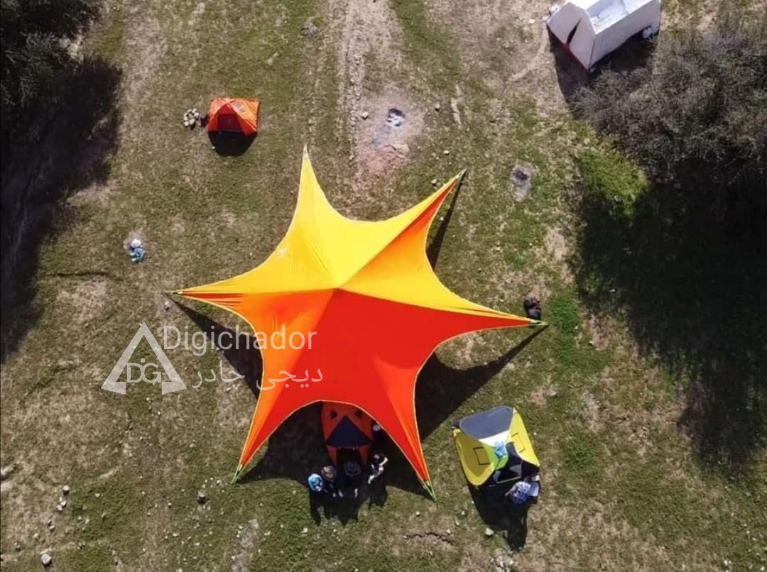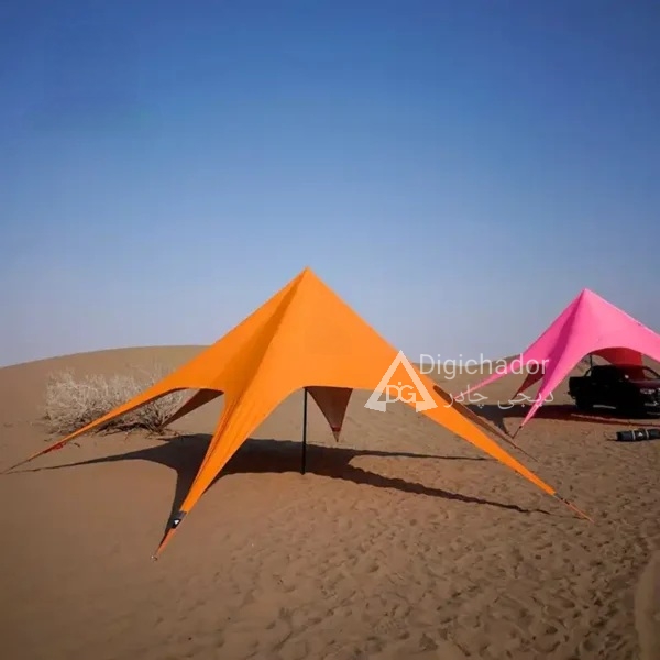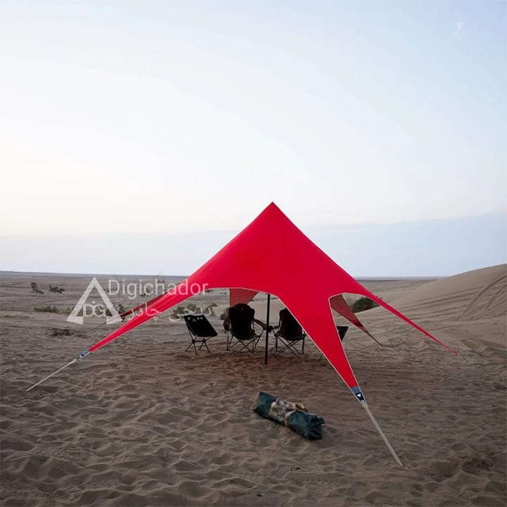 سایبان ستاره ای دیجی چادر یا همان استار تنت چادری بسیار جذاب و زیبا برای کمپها دورهمی ها، گروه های ورزشی همچنین همایش و مراسمات و جشن های شما می باشد که علاوه بر طراحی زیبا و چشمگیر از رنگهای بسیار جذابی بهره میبرد. اغلب در سفرها، اطراف سواحل و کویرها با مشکل نبود سایه مواجه هستیم حتی شاید ساعتها دنبال جای مناسب دارای سایه بگردیم یا مجبور به ترک کردن محل کمپ بشیم بخاطر بارش ناگهانی باران. سایبان ستاره ای رو میتونید کمتر از ده دقیقه بنا کرده از محل حفاظت شده آن لذت برده و از طراحی جذاب ان متعجب شوید و در کنار عزیزانتان بهترین لحظات را ثبت نمایید. بزرگترین مزیت استارتنت دیجی چادر نسبت به مدلهای موجود در بازار نوع پارچه آن است که جنس پارچه از گوتکس ضد آب و آب گریز بسیار مقاوم است و نسبت به مدلهای پلی استر موجود در بازار ضخامت و مقاومت بیشتری دارد همچنین دوخت صنعتی و سه سوزنه آن در مقابل کشش های ناشی از جریان باد و بارش باران مقاومت بالایی دارد. طراحی استار تنت دیجی چادر به نحوی بوده تا بتواند بیشترین مساحت سایه را ایجاد کند، همچنین ارتفاع قسمتهای هلالی ان بلند درنظر گرفته شده تا علاوه بر گردش ازاد هوا، رفت و آمد افراد زیر آن به راحتی میسر باشد، همچنین بتوان زیر آن چندین میز و صندلی برای حتی گروه های پر جمعیت قرار داد.یا چندین چادر در زیر آن بنا کرد همچنین قابلیت ورود خودرو به زیر سایبان هم وجود دارد، تا در مقابل بارشهای ناگهانی و تابش مستقیم نور آفتاب در امان باشید. در طراحی این محصول قسمتهایی بصورت جیب برای نگه داری از لوازم کوچک مانند گوشی موباید یا پاور بانک در نظر گرفته شده، و در قسمت هلالی تسمه هایی برای نصب ریسه دوخته شده که میتوان با نصب لامپ ریسه ای محیطی رویایی را در تاریکی شب ایجاد کرد. ضمنا این محصول دارای کیت حرفه ای برای نصب میباشد که شامل: 6 عدد میخ صلیبی آبکاری شده می باشد.جهت آشنایی بیشتر با محصول ویدیوها معرفی و نصب محصول در همین صفحه را رویت بفرمایید.