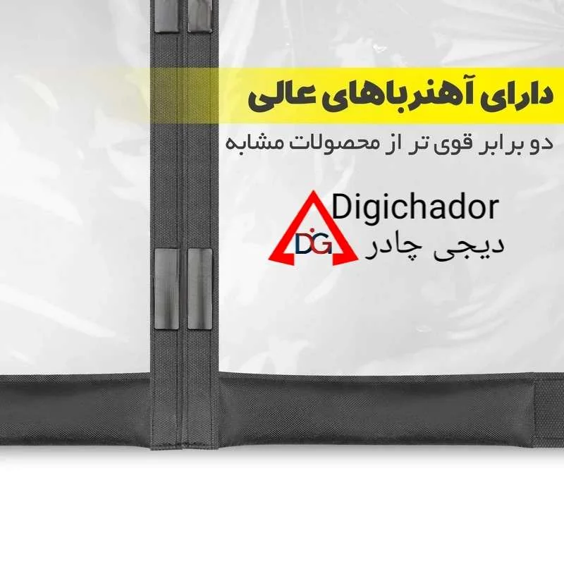 درب نایلونی مغناطیسی تیم صنعتی دیجی چادر با استفاده از مواد اولیه درجه یک، نایلون وارداتی و منتهای دوبل قوی که زیر نظر نفرات کنترل تولید در همه مراحل، با کیفیت برتر در میان نمونه های داخلی و خارجی تولید و عرضه میگردد. پرده پلاستیک آهنربایی دیجی چادر جنس پلاستیک نوع خارجی بسیار شفاف و انعطاف پذیر کریستال با ضخامت 0.25 بهره می‌برد که کیفیت بالای این متریال موجب گشته تا در سرمای شدید آسیب نبیند و ترک نخورد و همچنین طی مدت استفاده دچار تغییر رنگ نگردد و کیفیت خود را حفظ نماید. این مدل پرده های پلاستیکی را می توان هم در فصول سرد و هم در فصول گرم سال استفاده نمود تا از هدر رفت سرما و گرما جلوگیری کرد، این امر باعث می شود تا مصرف انرژی تا میزان قابل توجهی کاهش یابد. مگنت های متعدد و زیاد استفاده شده در پرده ها دارای خاصیت آهنربایی بالایی بوده و پس از هر بار ورود و خروج، پرده به صورت اتوماتیک بلافاصله بسته می شود. از دیگر خصوصیات این محصول استفاده از زیپ چسب های قوی برای چسباندن پرده بر روی چهارچوب می باشد که به سفارش خود شرکت ، به چسب مسلح شده اند.نصب آسان، و بسته بندی مناسب، تنوع سایز، طول عمر بالا، استفاده از بسته آویز شن در پایین پرده برای ایستایی بهتر و دوخت زیبا از دیگر مشخصات این پرده می باشد. از این پرده ها می توانید برای درب ورودی باغ، مغازه، منزل، بالکن و ... استفاده نمایید.