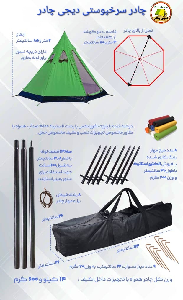 زمانی که در میان درختان سپری میشود، هرگز وقت تلف نمیشود... چادر سرخپوستی vip دیجی چادر ، طراحی خاص،پارچه گورتکس، کف ضخیم ، دریچه لوله بخاری با پارچه نسوز، کف زیپدار برای نصب بخاری،ستون قوی با رنگ چکشی الکترواستاتیک، دوخت صنعتی گاندوزی شده و چندین ویژگی منحصر به فرد دیگر که همه و همه در چادر vip سرخپوستی دیجی چادر جمع شده اند. درب و پنجره طلقی این محصول را به چادری چهارفصل تبدیل کرده و در زمستان هم به راحتی میتوانید از دیدن طبیعت بیرون لذت ببرید. درب و پنجره مجهز به توری نیز در این چادر تعبیه شده که از فصل گرم نیز با تهویه خوب به دور از حشرات از سفر و کمپ خود لذت ببرید. ارتفاع بلند و کف وسیع چادر به راحتی فضایی برای نشستن ۱۰ الی ۱۴ نفر و یا خواب ۵ الی ۷ نفر را فراهم میکند. پارچه پشت لاستیک وارداتی (کره ای) با تحمل بالا در شرایط مختلف آب و هوایی عمر مفید این چادر را ۱۰۰درصد افزایش داده و دوخت گان دوزی شده این چادر را در برابر باران و برودت سرما محفوظ میکند. با وجود تمام این ویژگی های خاص پیرو تولید انبوه، دیجی چادر توانسته این محصول را با نازلترین قیمت در بازار نسبت به نمونه های مشابه ارائه کند تا خیال مشتریان از نظر قیمت هم آسوده باشد . دیجی چادر همراه همیشگی دوستداران طبیعت...جهت آشنایی بیشتر با محصول ویدیوها معرفی و نصب محصول در همین صفحه را رویت بفرمایید.و در آخر امضای دیجی چادر گارانتی محصول است که ۶ ماه دوخت و پارچه و کیف چادر را ضمانت میکند و ۲ سال خدمات پس از فروش محصول خیال شما را از یه چادر حرفه ای راحت میکند.