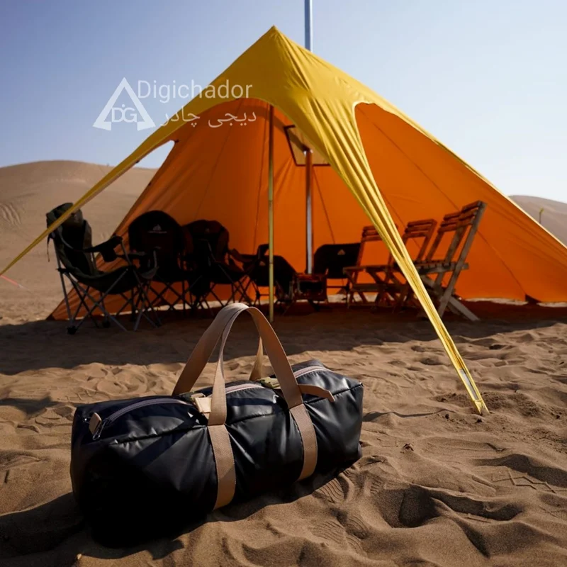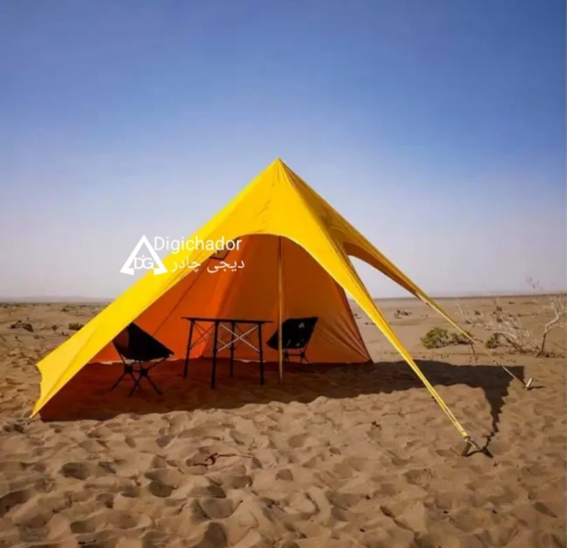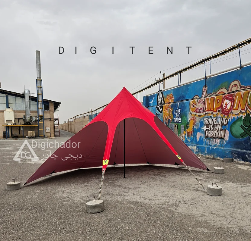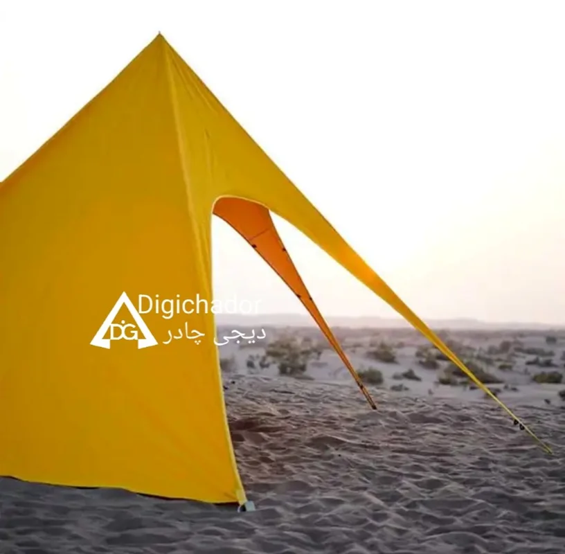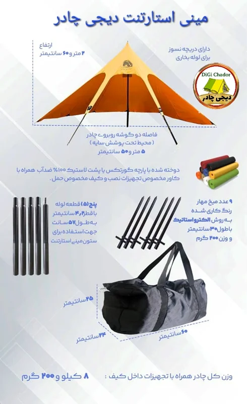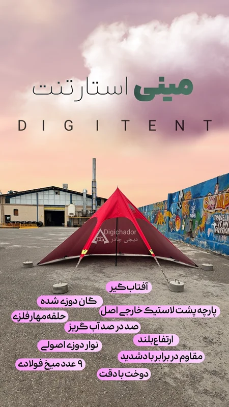 مینی استارتنت دیجی چادر یک سایبان ستارهای کوچک، کم حجم و کاربردی با فضای سایه زیاد برای ۸ الی ۱۰ نفر است. این سایبان دارای عایق نسوز است برای قسمت لوله بخاری است و از آنجایی که پارچه آن ضدآب است علاوه بر استفاده در فصل تابستان به عنوان یک سایبان، میتوانید در فصل زمستان در هوای بارانی و برفی زیر آن از بخاری هیزمی استفاده کنید و دودکش آن را از قسمت عایق نسوز رد نمایید. به دلیل اینکه سه طرف این مینی استارتنت دیجی چادر کاملا بسته است می توانید طرف بسته را رو به خورشید قرار دهید تا بیشترین فضای سایه را داشته باشید . جنس میخ های این سایبان از فولاد ck۴۵ است که مقاومت بالایی در برابر خم شدگی دارد و برای زمین های سنگلاخی و جنگلی مناسب است. چنانچه قصد استفاده از این سایبان، در ساحل یا کویر را دارید، باید میخ های مخصوص کویر را جداگانه خریداری کنید. متعلقات:دارای ۹ عدد میخ ۲۵ سانتی متری با ضخامت ۱۰mm مناسب زمین های سفت و سنگلاخی, دارای میله مرکزی, دارای عایق نسوز برای رد کردن دودکش بخاری هیزمی است.جهت آشنایی بیشتر با محصول ویدیوها معرفی و نصب محصول در همین صفحه را رویت بفرمایید.