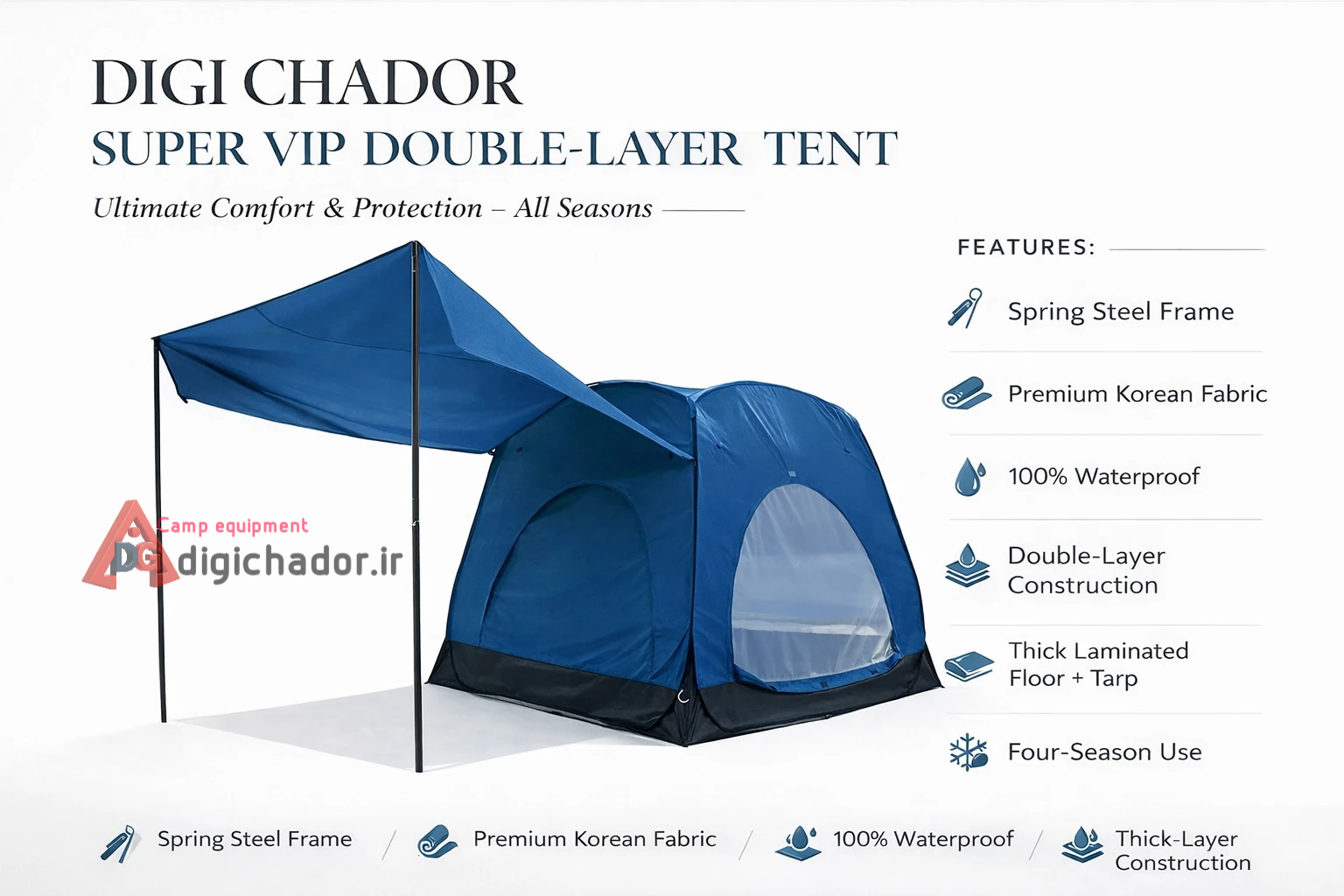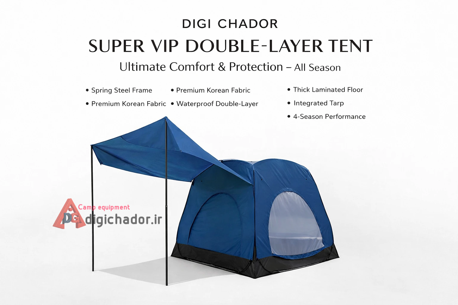 چادر مسافرتی فنری مدل کوبیک دوپوش vip سایبان دار پارچه کره ای هشت نفره دیجی چادر (رنگ آبی کاربنی)
