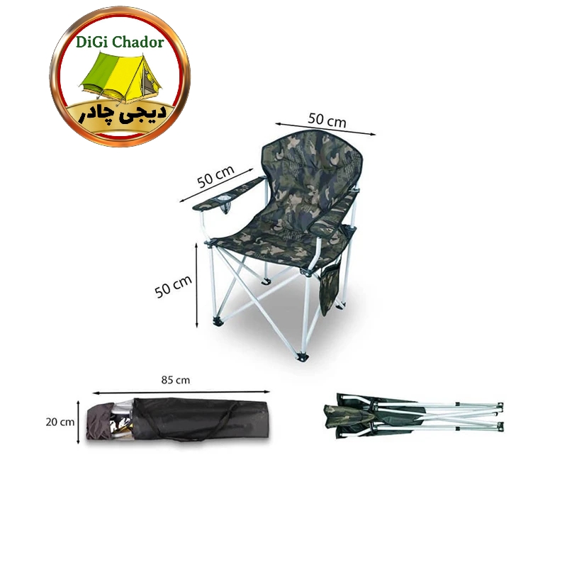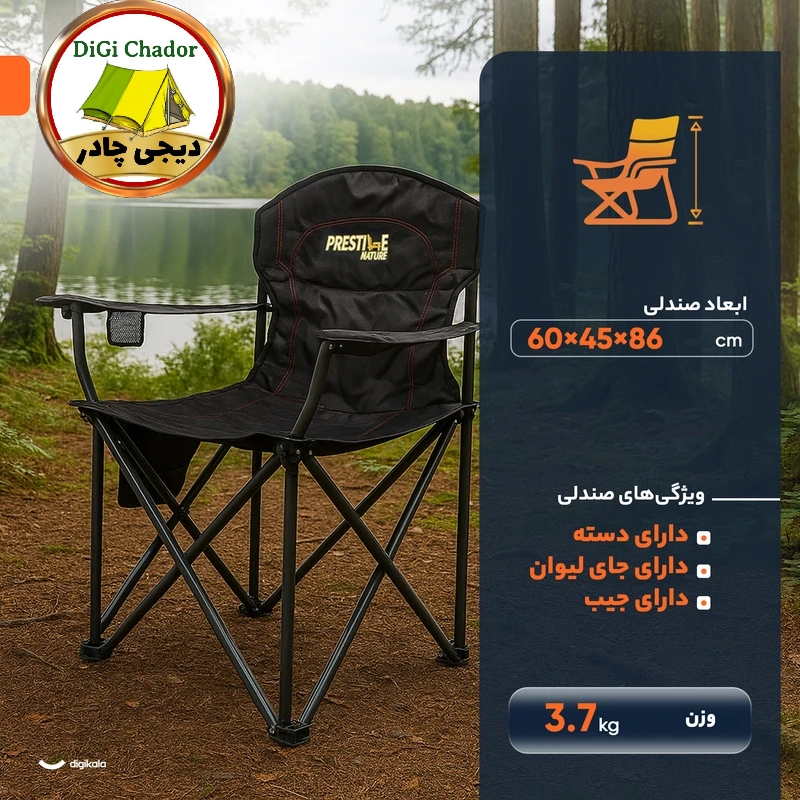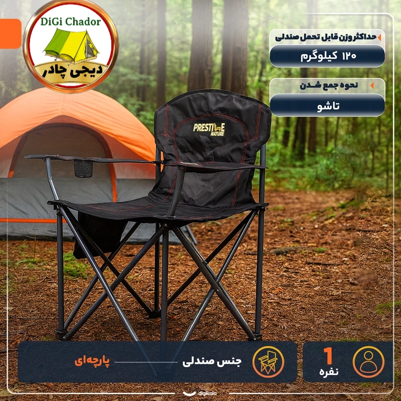 صندلی کارگردانی پرستیژ دیجی چادر: راحتی صندلی تاشو پرستیژ (Prestige Camping chair) به گونه‌ای است که در حالت بسته فضای استوانه ای و کمی اشغال می‌کند و حمل آن در خودرو بسیار آسان است. این صندلی مناسب استفاده در سواحل، جنگل و فضاهای باز است؛ کافی است آن را باز کنید و راحتی و کیفیت یک صندلی کمپ را تجربه کنید. از ویژگی‌های برجسته این محصول، تکیه‌گاه بزرگ برای کمر و دو تکیه‌گاه دست است. همچنین جایگاه تعبیه‌شده برای لیوان روی یکی از دسته‌ها، نوشیدن مایعات را بدون نگرانی از ریختن ممکن می‌سازد. وزن سبک حدود ۳.۵ کیلو این صندلی حمل و جابه‌جایی آن را آسان کرده است. پارچه برزنتی با کیفیت استفاده‌شده در ساخت، مقاومت بالایی در برابر تغییر رنگ و شکل دارد. دوخت‌های مستحکم این صندلی پس از شستشو و در برابر وزن‌های بالا و ضربه، دوام خوبی نشان داده و از هم گسیخته نمی‌شوند. این صندلی انتخابی مناسب برای سفر و کمپینگ با تمرکز بر راحتی و دوام است.